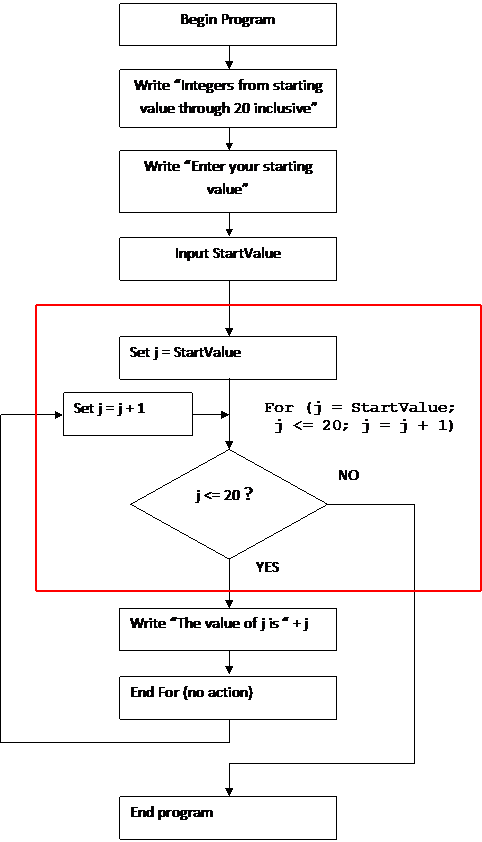 Note that the "For" statement corresponds to three symbols in the flowchart; they are enclosed by the red box. Each of the three parts of the "For" corresponds to one of the symbols in the box.