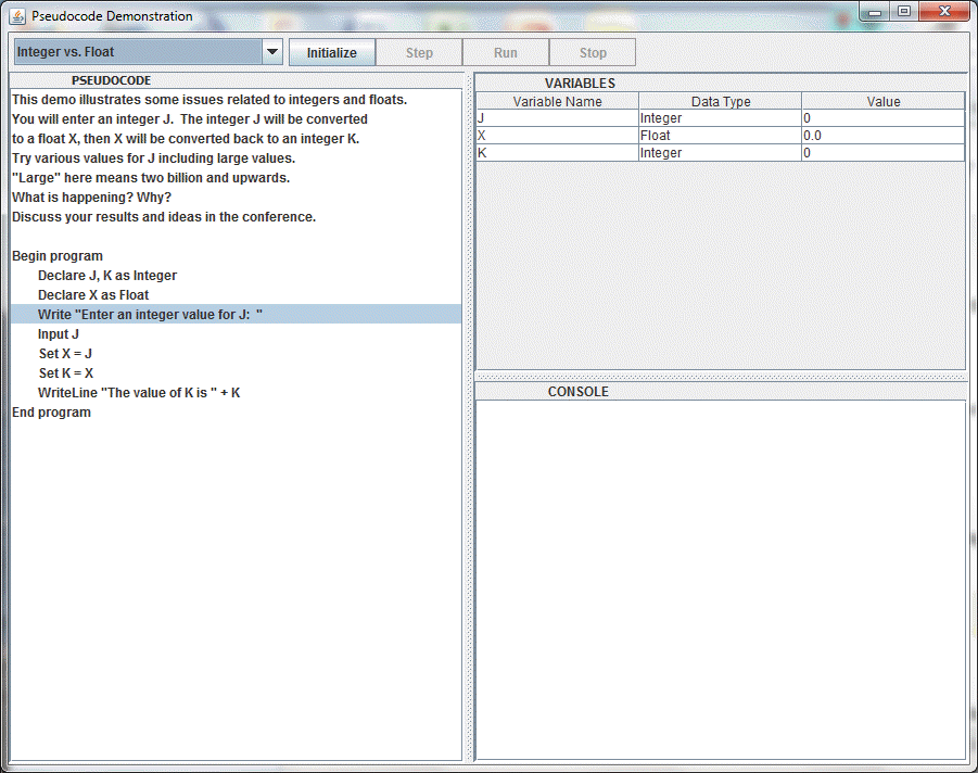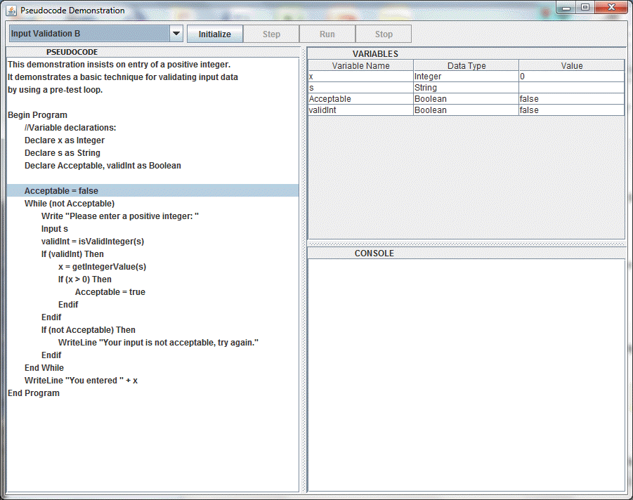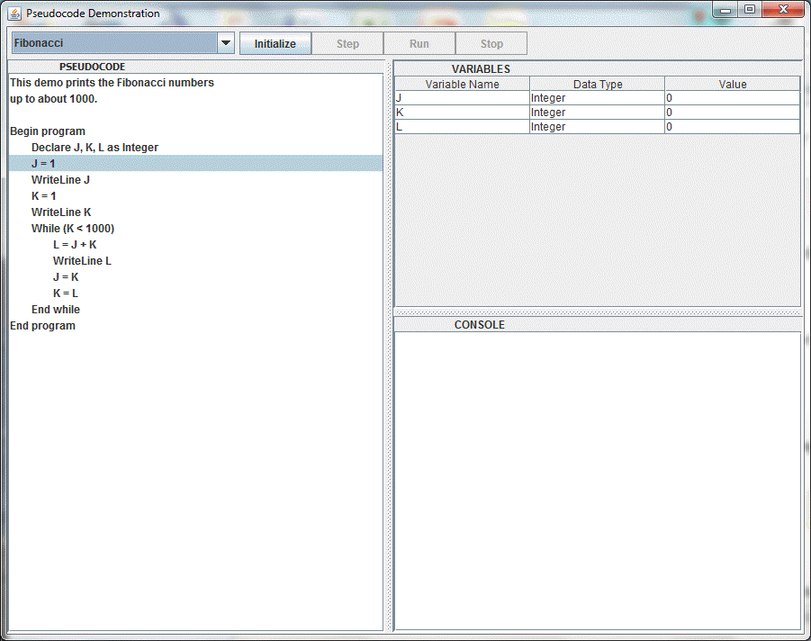 Click Step to execute one line of pseudocode at at time, or